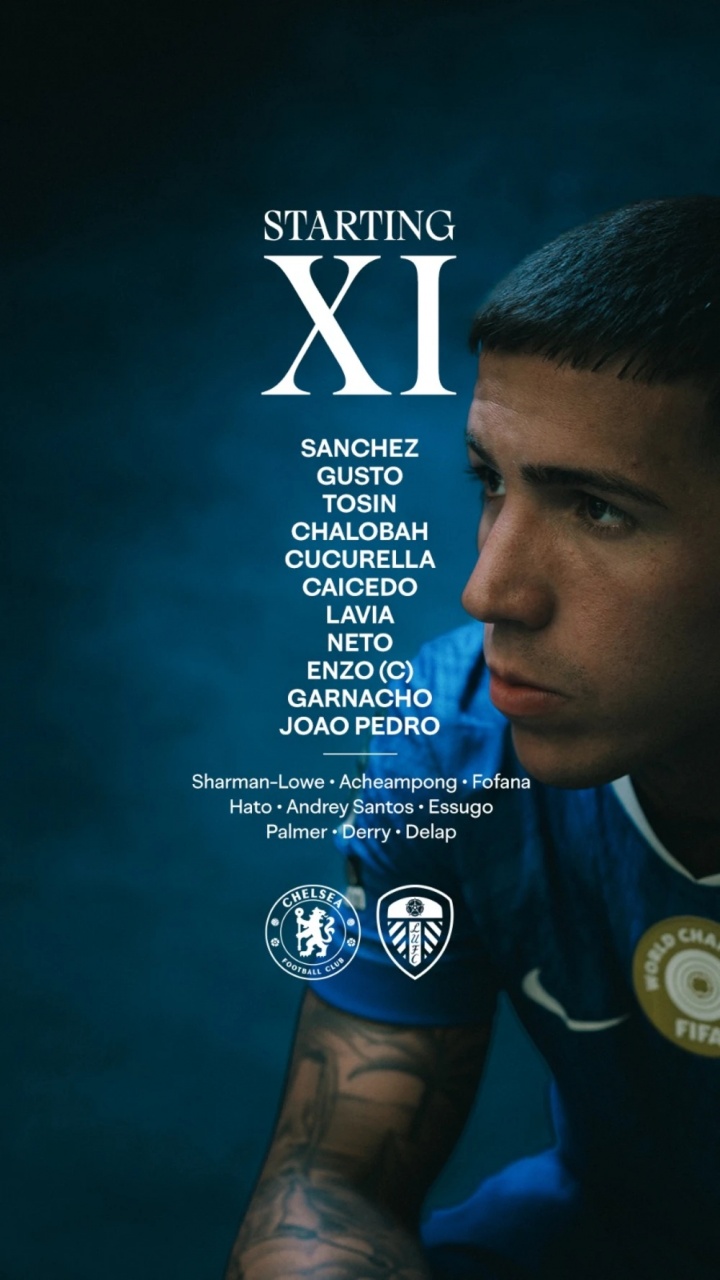 切尔西杆位:1-桑切斯、27-古斯托、4-阿达拉比奥尤、23-查洛巴、3-库库雷利亚、25-凯塞多、45-拉维亚、7-内托、8-恩佐、49-加纳乔、20-若昂·佩德罗