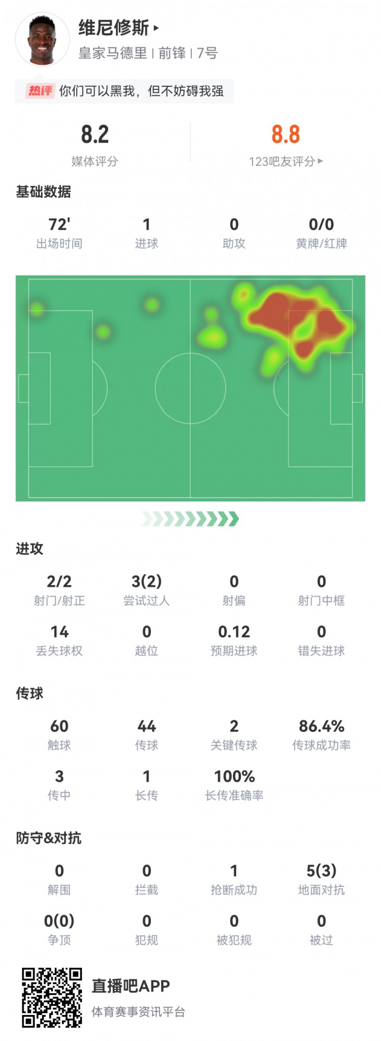 一条龙破门!维尼修斯数据:2射2正1进球,2过东说念主2要道传球评分8.2