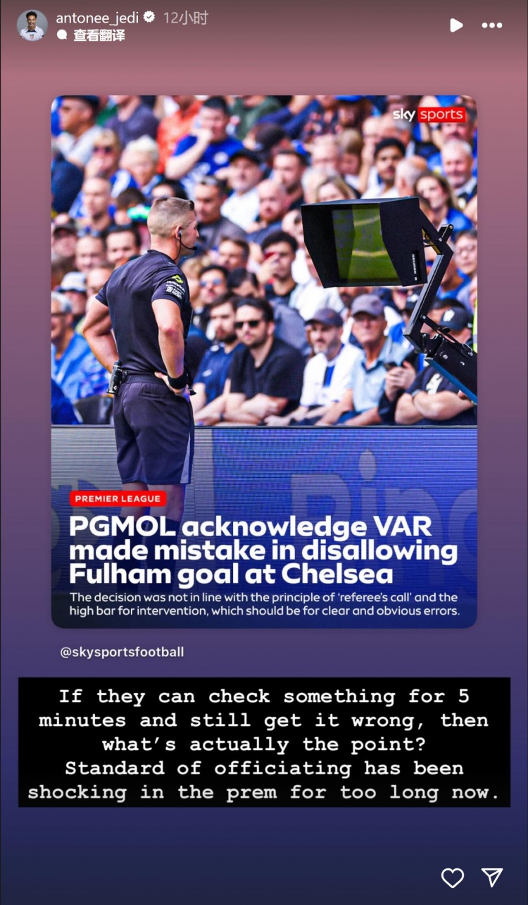 9月1日讯 富勒姆球员罗宾逊更新社媒,月旦英超裁判的水平。