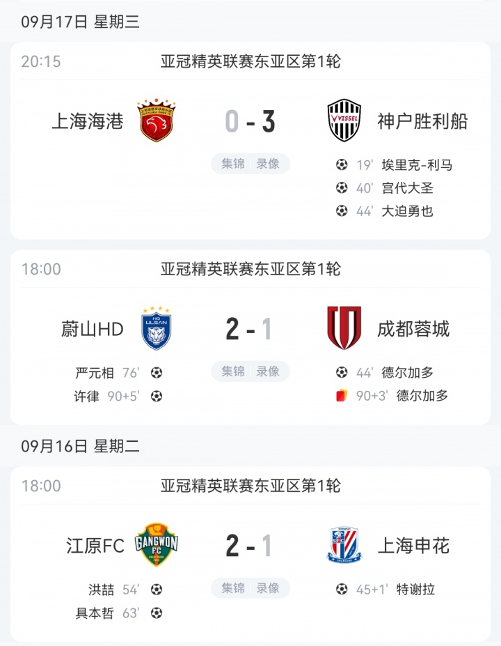 首轮比赛,蓉城、海港、申花出战亚冠精英联赛全败。