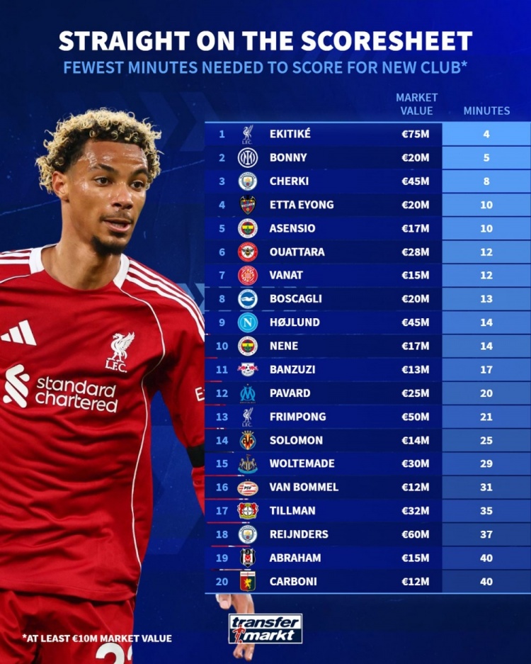 今夏新援最快攻入首球名次:埃基蒂克4分钟居首,博尼5分钟次席