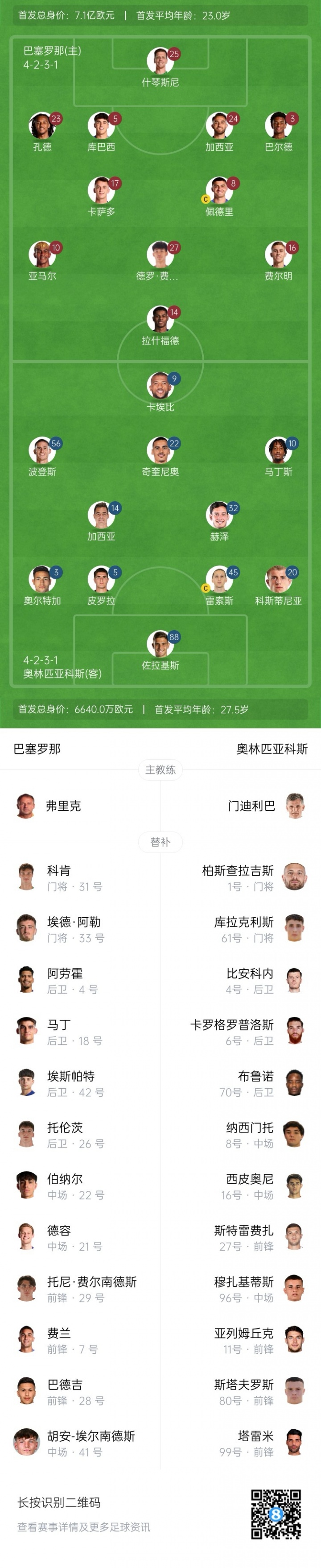 巴萨首发:25-什琴斯尼、23-孔德、24-埃里克·加西亚、5-库巴西、3-巴尔德、17-卡萨多、27-德罗·费尔南德斯、8-佩德里、16-费尔明、10-亚马尔、14-拉什福德