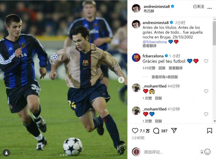 伊涅斯塔晒照回归2002年巴萨首秀:故事始于布鲁日的阿谁夜晚