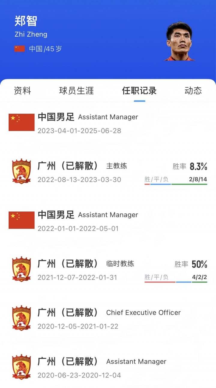 2021年12月7日,郑智出任广州队实行主教练兼球员。2022年1月,41岁的郑智出战广州队vs长春亚泰的中超比赛,这是他办事生活临了一次出场。2022年8月,郑智出任广州队主教练。 2023年2月27日,郑智出任国足助教 。跟着伊万离任,郑智也退放洋足助教团队。