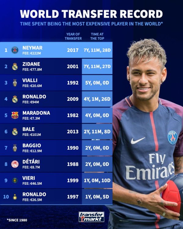 德转:内马尔成为保抓最高转会身价最久的球员 此前是都达内