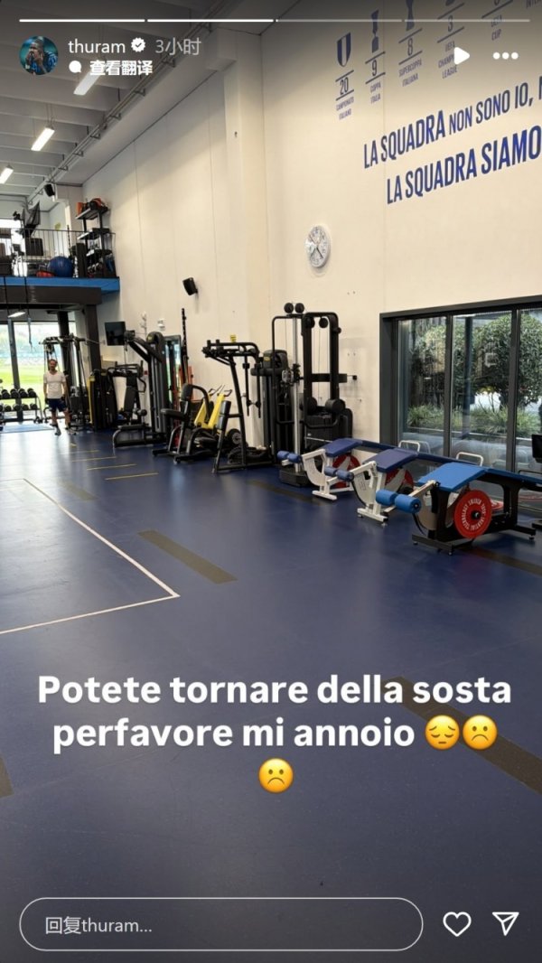 10月13日讯 国米时尚图拉姆社媒喊话队友,但愿他们快点从国度队回到俱乐部。 图拉姆因左腿股二头肌受伤缺席10月份的国度队比赛,他留在俱乐部进行康复磨砺,图拉姆社媒晒出空荡荡健身房的相片,配文:“求你们快点从国度队总结吧,我好败兴。” 阐发意大利太空体育的报说念,图拉姆展望将缺席国米对阵罗马的比赛。......查看更多