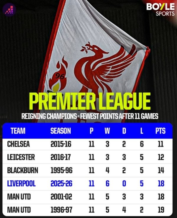 利物浦本赛季前11轮18分,英超历史卫冕冠军同时第四少