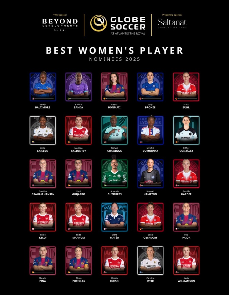 11月19日讯 各人足球奖公布了2025年最好女足球员候选名单,邦马蒂、汉森、汉普顿、普特拉斯、凯莉、鲁索在列。