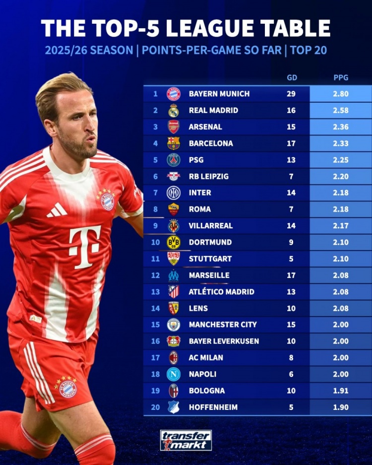 11月21日讯 五大联赛战火行将重燃,《转会市集》也统计了本赛季五大联赛球队场均拿分情况,拜仁独自领跑。