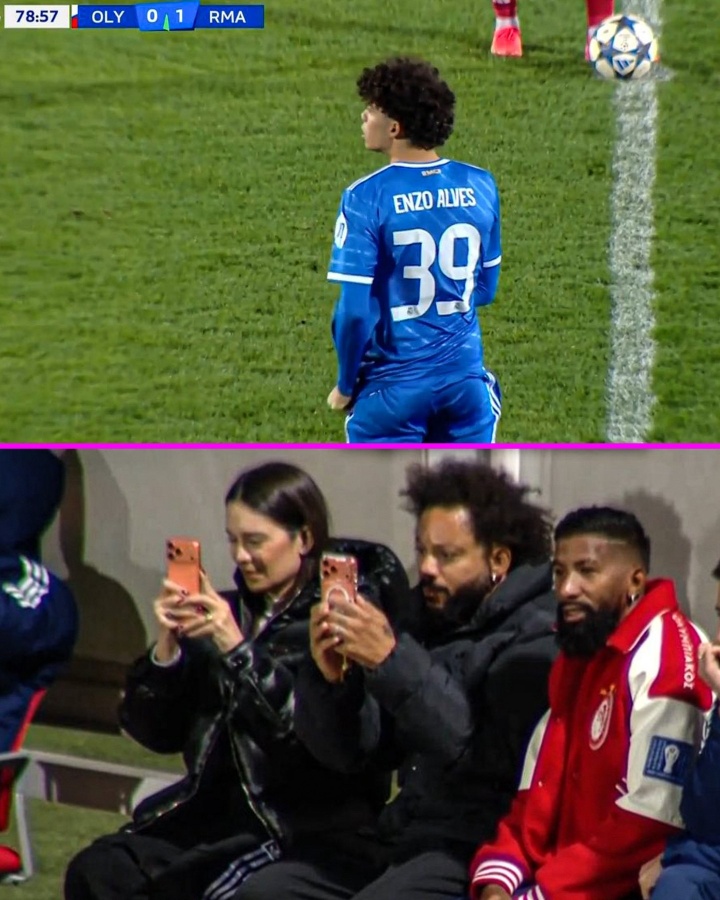 16岁的恩佐·阿尔维斯在第79分钟替补登场,镜头给到场边的父亲马塞洛,后者正在用手机拍下女儿首秀的一霎。