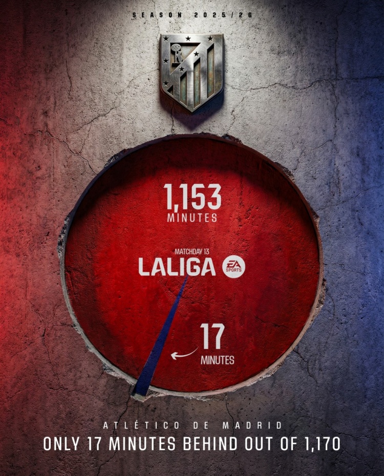 据西甲官方统计,在本赛季于今1170分钟的西甲比赛技术里,马竞仅落伍过17分钟,是本赛季西甲落伍技术最短的球队。