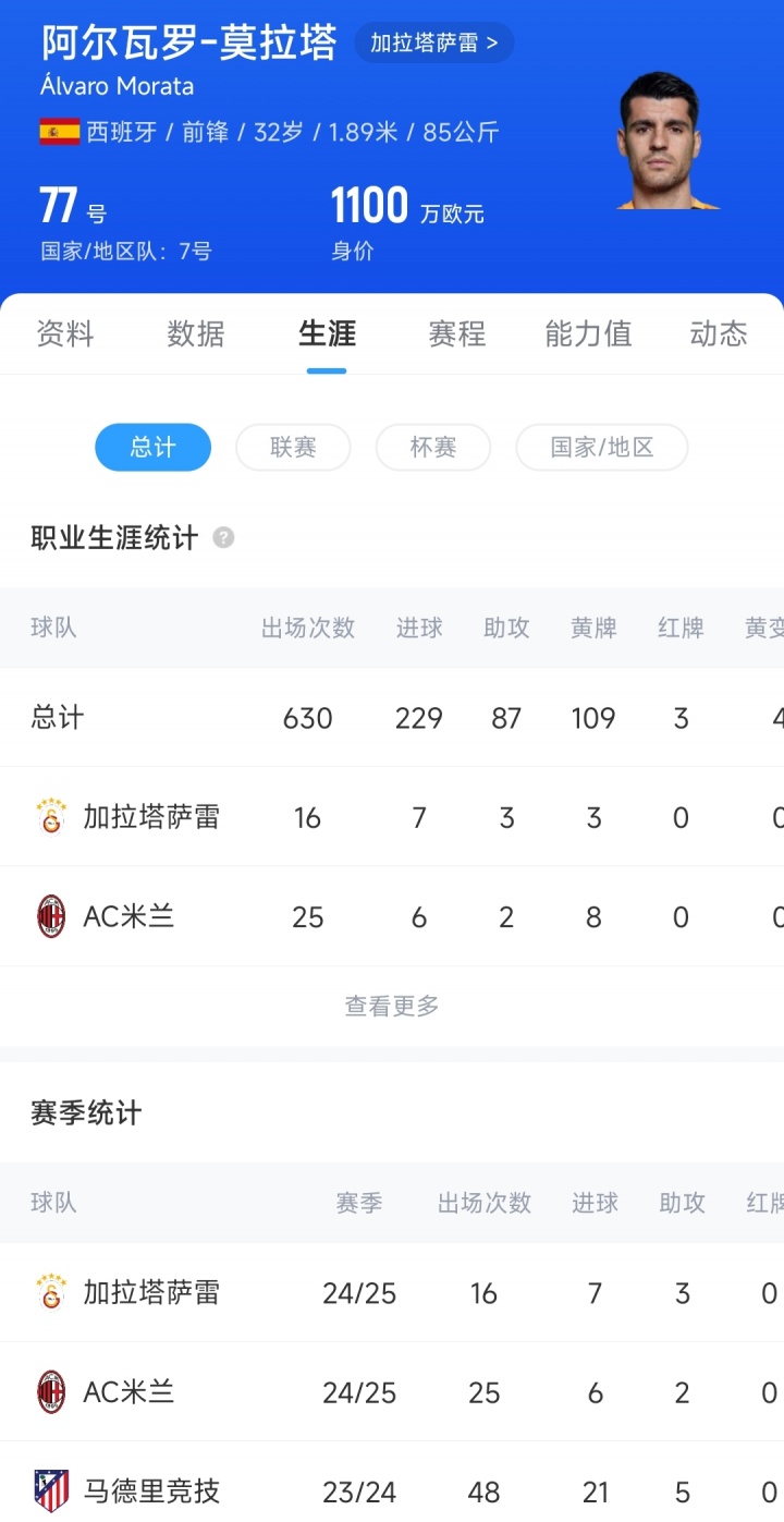 32岁的西班牙先锋莫拉塔,上赛季被AC米兰租赁到加拉塔萨雷,共代表加拉塔萨雷出场16次,孝顺7粒进球和3次助攻。现在莫拉塔的德回身价为1100万欧。