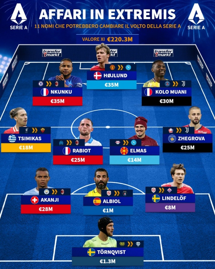 8月28日讯 德转官推当天更新,盘货了在今夏转会规章日前潜在加盟意甲联赛的球员,并将这些球员以3-4-3的阵形列举出来,其中霍伊伦、恩昆库、穆阿尼等在列。
