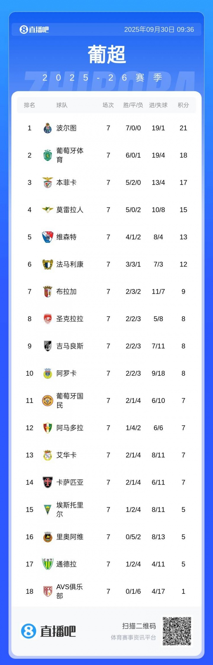 当今波尔图3分领跑葡超,排第2的是葡体。波尔图的死敌本菲卡暂时4分过期,排在第3位。下一轮葡超,便恰是葡萄牙国度德比:10月6日,波尔图vs本菲卡。
