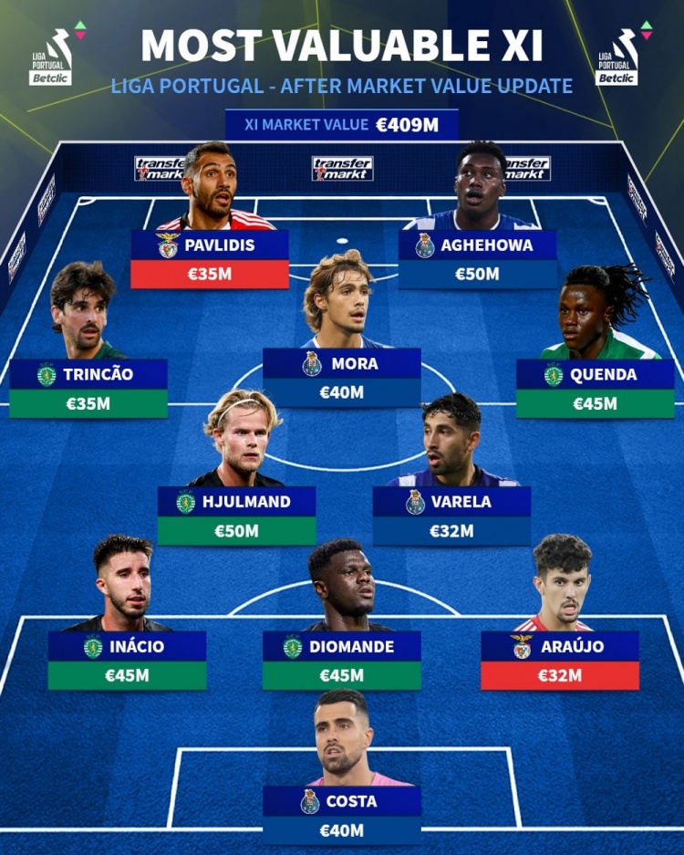 前卫:特林康(葡萄牙体育,3500万欧)、帕夫利季斯(本菲卡,3500万欧)、阿格霍瓦(波尔图,5000万欧)、昆达(葡萄牙体育,4500万欧)