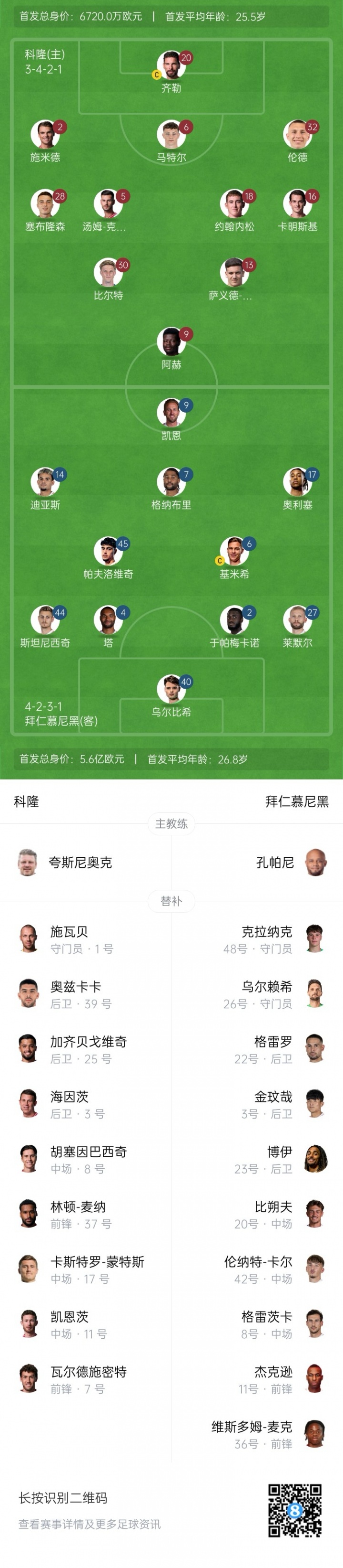 10月30日讯 德国杯第2轮,拜仁客战科隆,赛前两边首发公布。