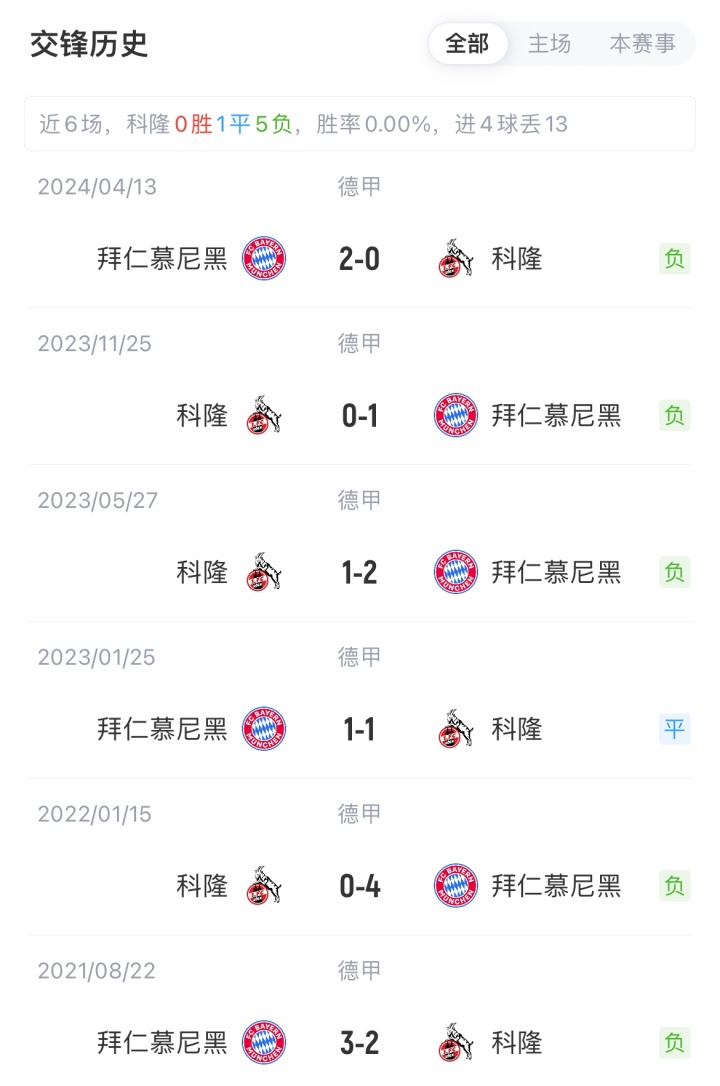 拜仁联赛8轮全胜积24分位居德甲榜首,开季13场全胜;科隆联赛3胜2平3负积11分暂位德甲第8,近2轮不堪。拜仁对阵科隆已贯穿20场不败(18胜2平)。