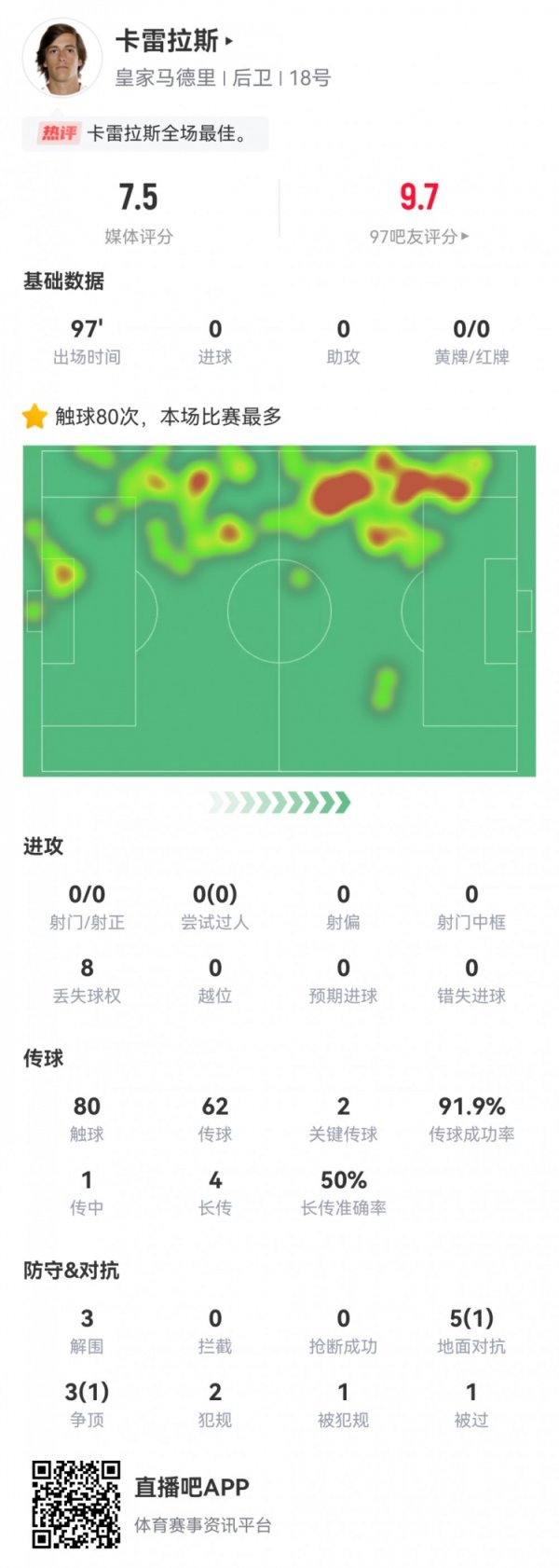 关节门线突围攻防俱佳!卡雷拉斯数据:2关节传球3突围,评分7.5