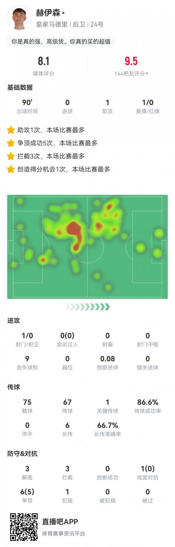 8月31日讯 西甲第三轮,皇马2-1马洛卡。此役赫伊森首发打满全场,球员全场要点数据如下↓ 1射0正 1次助攻 9次丢失球权 预期进球0.08 75次触球 传球得手率86.6% 1次要津传球 6次长传得手4次 3次突围 3次阻碍 7次拒抗得手5次 评分8.1......查看更多
