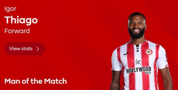 20分钟梅开二度,官方:伊戈尔当选布伦特福德3-1曼联全场最好