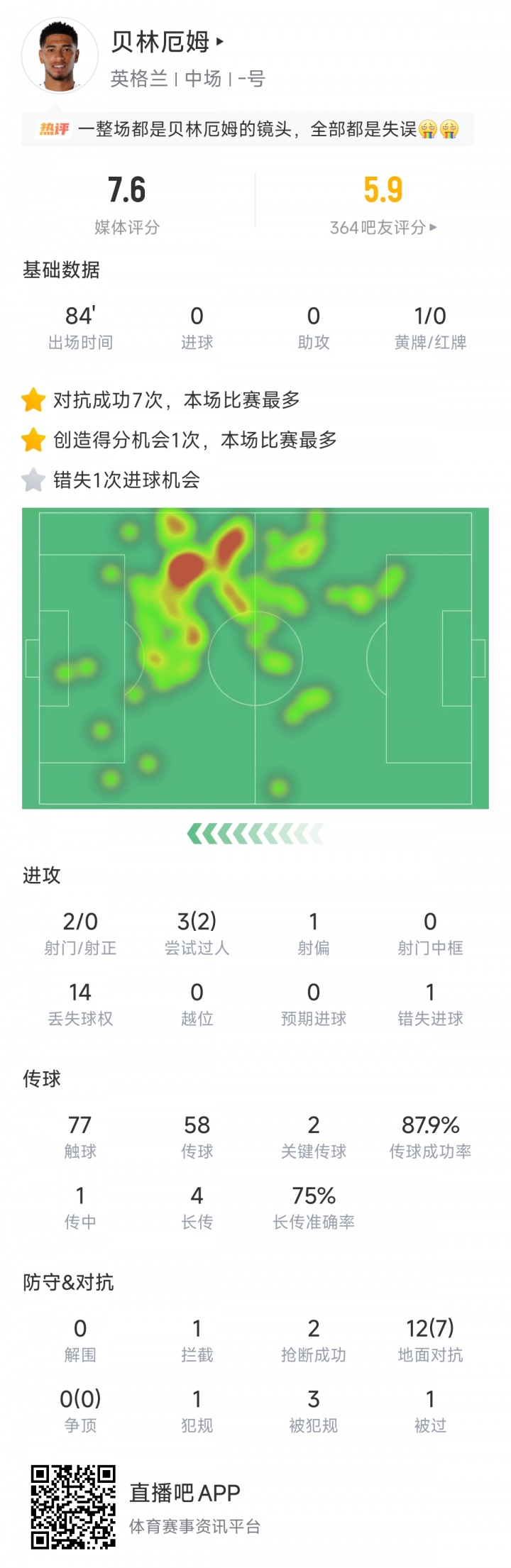 控球数据方面,77次触球14次丢球权,87.9%的传球告成率。贝林赛后评分7.6分,全场第3。双响的凯恩8.8分,评分第1,丹·伯恩7.8分第2。