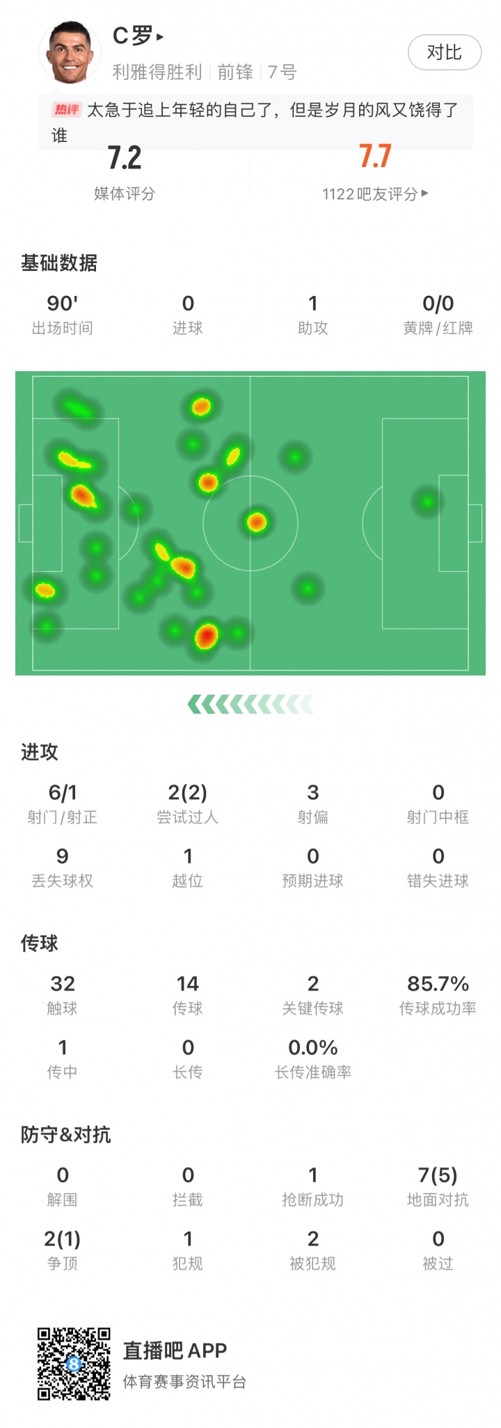 C罗全场数据:1次助攻,6脚射门1脚射正,2次过东说念主&7次拒抗5次顺利