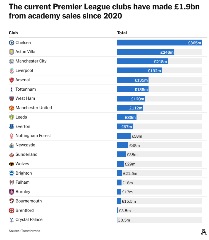 英超俱乐部出售青训球员的趋势,在一定经过上与英超球队购入英格兰年青球员的趋势相对消,以确保他们达到25东谈主大名单中8名原土球员的配额。