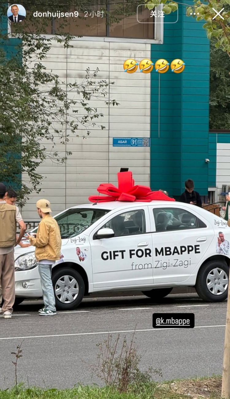 相片中阿拉木图街头泊岸着一辆喷有姆巴佩涂鸦的汽车,唐纳德-赫伊森也将这张相片@了姆巴佩,并附上4个“笑哭”色彩。