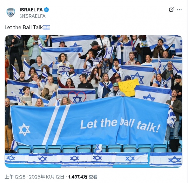 以色列足协援用横幅中的翰墨写说念:“让足球讲话”,意在敕令外界关切比赛而非政事抗议,但以色列最终大比分溃逃,这则帖文赛后也引来了上千条的回复。