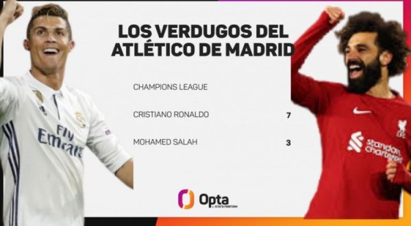 在欧冠赛场上,萨拉赫靠近马竞打进3球仅次于C罗的7球