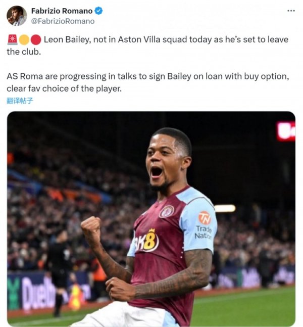 罗马诺:利昂-贝利缺席维拉首轮名单,罗马商谈租赁+接受买断球员
