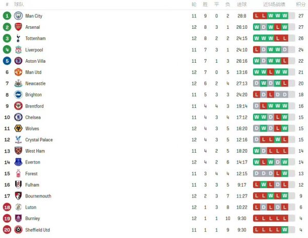 英超最新积分榜: 阿森纳暂列第二, 热刺降至第