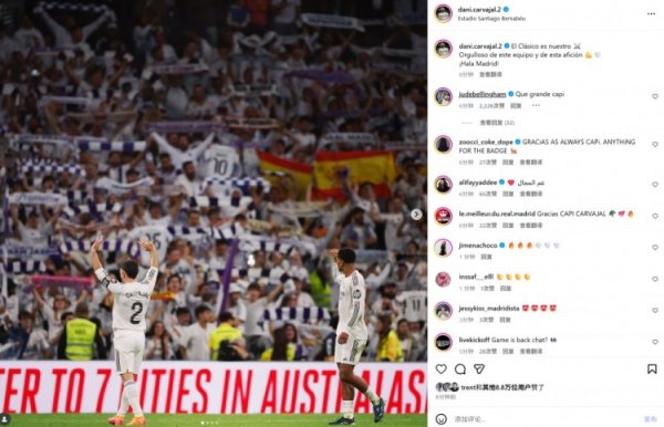 10月27日讯 在本轮西甲,皇马2-1打败巴萨。 本场比赛卡瓦哈尔替补登场,赛后他也在社媒晒出庆祝告捷像片,配文写说念:“国度德比告捷属于咱们,为这支球队以及这么的球迷感到骄矜!皇马加油!”......查看更多