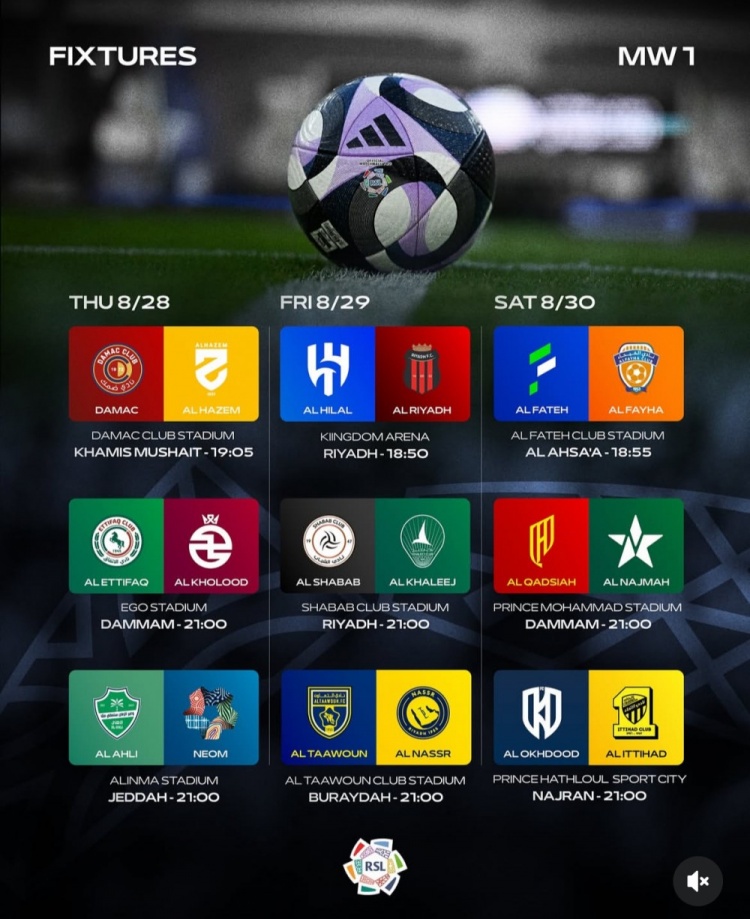 8月13日讯 新赛季沙特联将于本月底拉开帷幕。沙特联官方公布了2025/26赛季首轮9场比赛的比赛本领,具体如下(本领换算为北京本领,主队在前):
