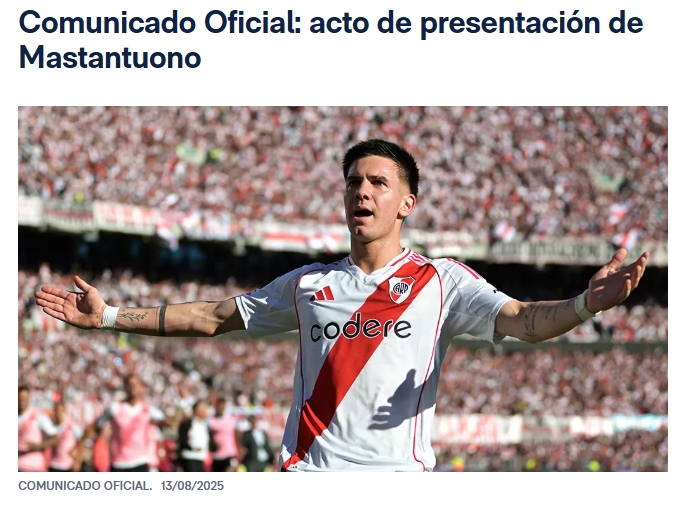 本年6月,皇马官宣签下马斯坦托诺,把柄河床官方的说法,马斯坦托诺的转会总价高达6320万欧元,成为阿根廷足坛史上最贵转会。惧怕税费等其他用度,河床俱乐部将收到4500万欧的转会费。