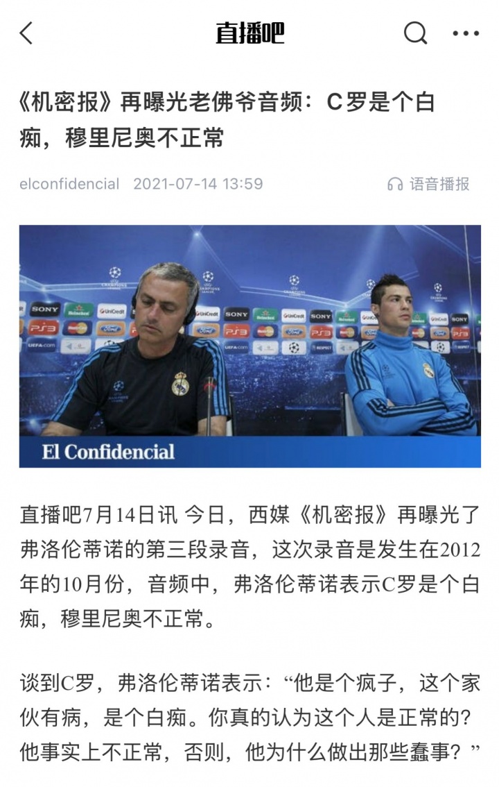 《艰深报》于2021年接连曝光了多条弗洛伦蒂诺的通话灌音,其中的爆炸言论包括“C罗是个疯子”、“穆里尼奥抗争日”、“卡西险些是哈巴狗”、“劳尔、卡西是骗子”等等。