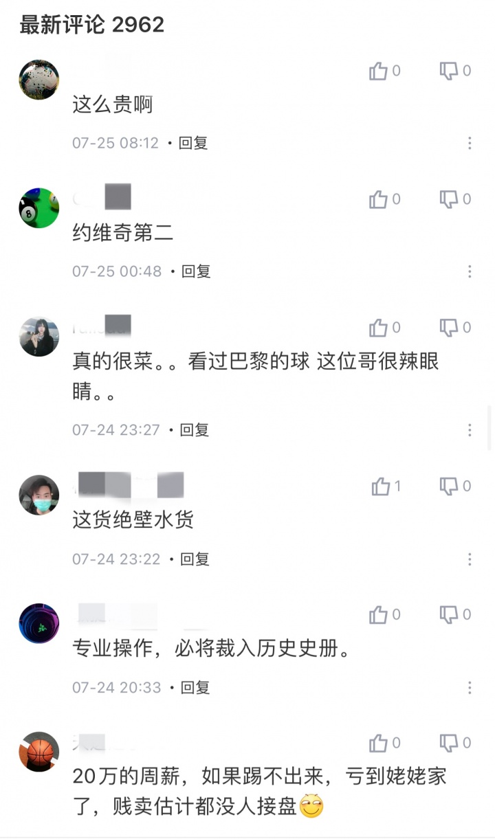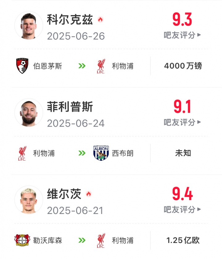 在7月24日利物浦官宣签下埃基蒂克时,评述区不少质疑声。吧友们仅给埃基蒂克的转会打出6.3的评分,评分呈现南北极分化趋势,远低于维尔茨的9.4分和科尔克兹的9.3分。