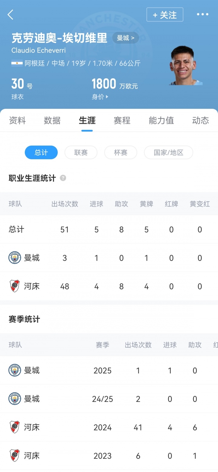 19岁的埃切维里冬窗认真加入曼城声威,现在仅为曼城出场过3次,孝敬1粒进球,现身价1800万欧。