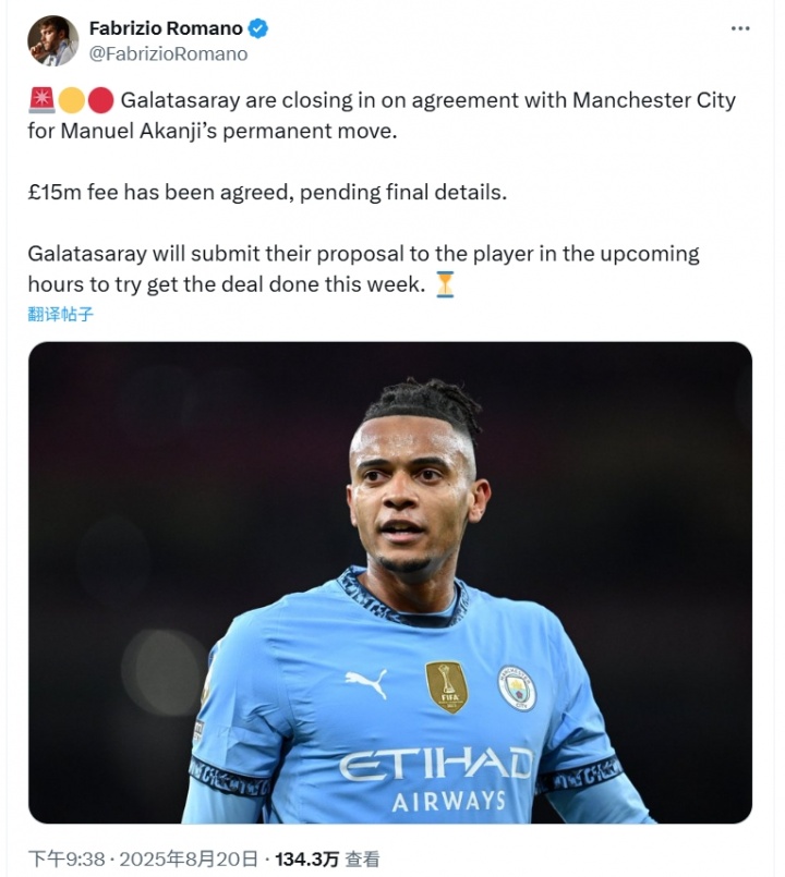 08月20日讯 罗马诺此前报谈称,加拉塔萨雷行将与曼城就阿坎吉收尾条约。