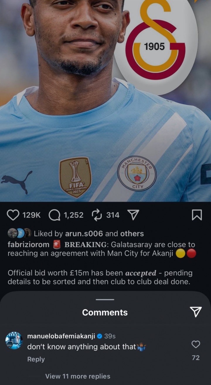 惨遭本东谈主打脸!阿坎吉在罗马诺的帖子下复兴:我咋啥王人不知谈