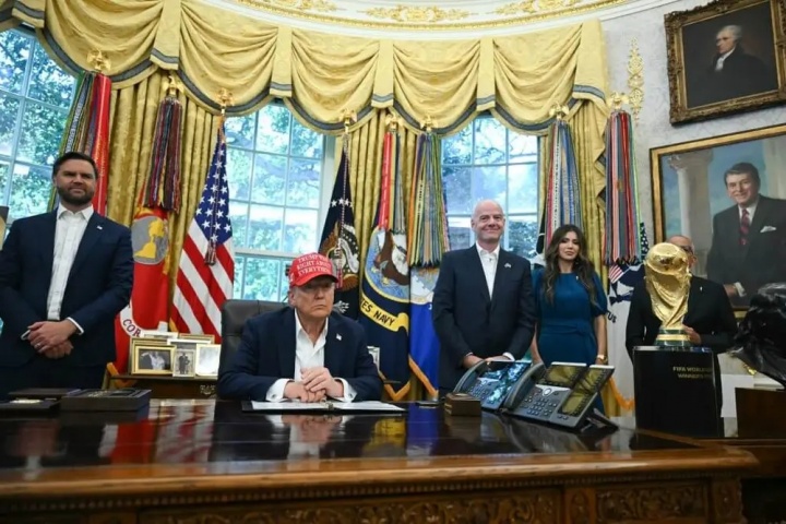 副总统JD-万斯(左一)、外洋足联主席詹尼-因凡蒂诺(右二)及国土安通盘长克里斯蒂-诺姆(右一)共同见证这次公告。