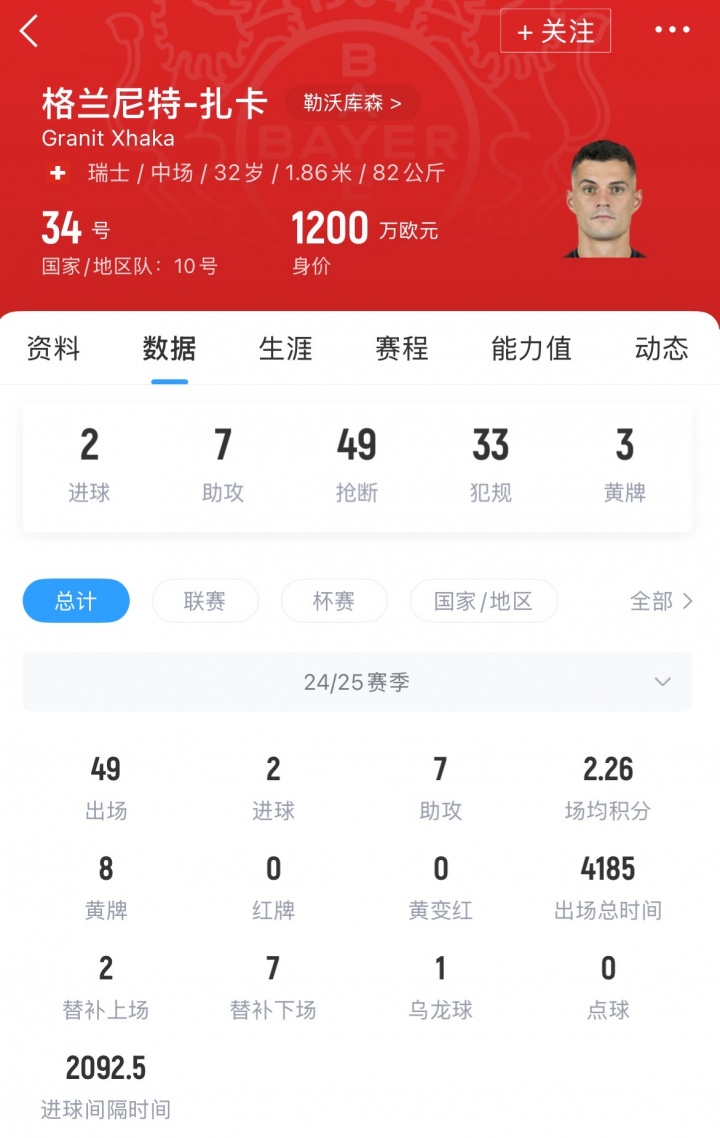 扎卡现年32岁,现着力于勒沃库森,球员曾在2016年以4500万欧元转会费加盟阿森纳,在着力枪手7年之后,勒沃库森破耗1500万欧元(据德转数据)签下扎卡,球员在昨年随队取得德甲以及德国杯冠军。现在扎卡德回身价为1200万欧元。