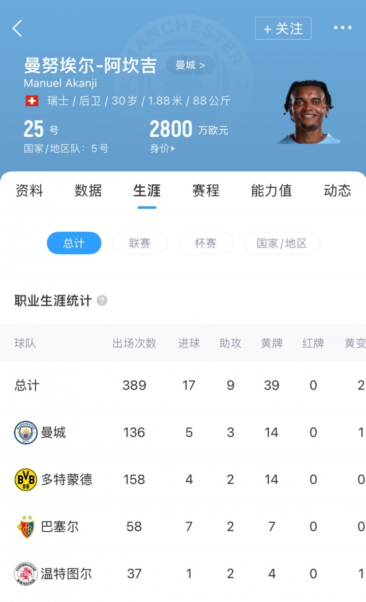 阿坎吉现年30岁,司职后卫,上赛季代表曼城各赛事出场37次,孝顺1助。当今阿坎吉德回身价为2800万欧元。