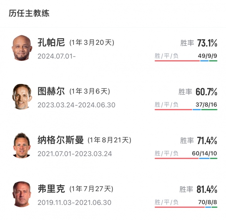 休止8任主帅!孔帕尼是15年来首位续约的拜仁主帅,前次是范加尔