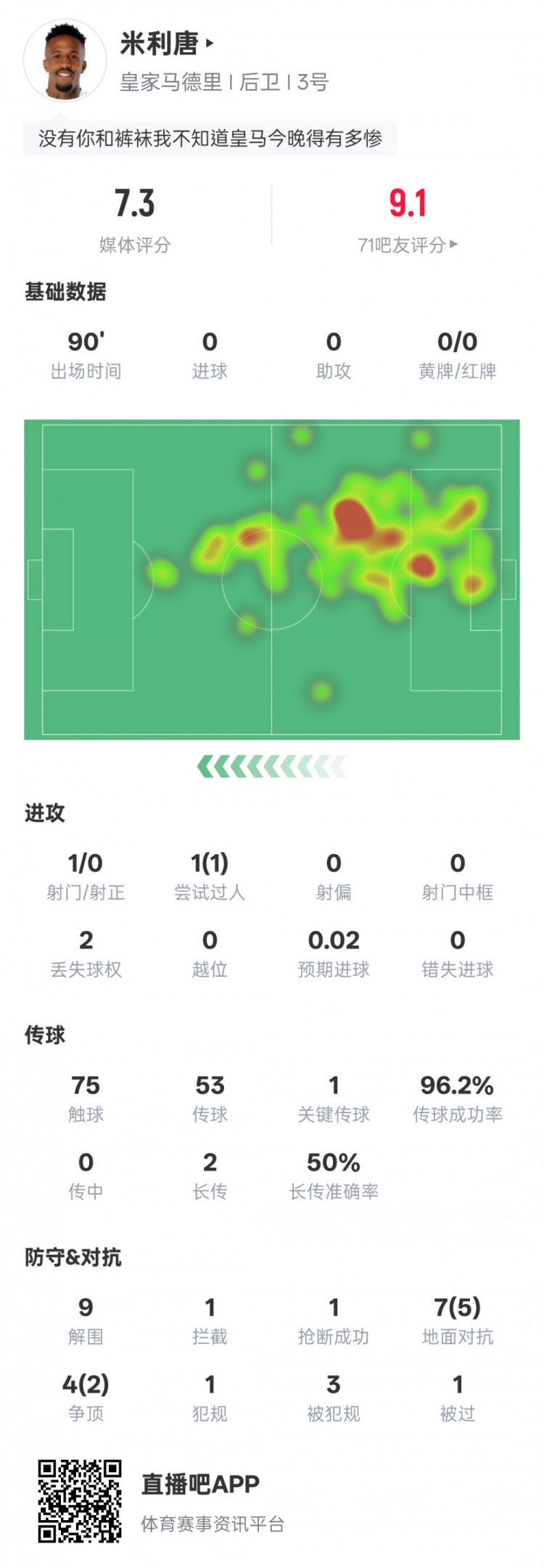米利唐本场数据:1重要传球9突围+传球奏着力96.2%,评分7.3