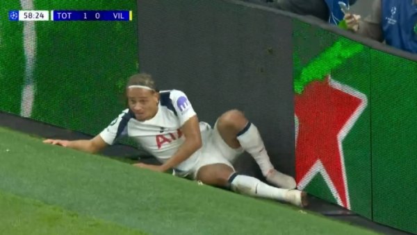 09月17日讯 欧冠首轮,热刺vs黄潜。 比赛第59分钟,热刺焦虑,哈维西蒙斯底线尝试救球时滑出场外,撞到场边的告白牌,不错明显看到被撞到的那块告白牌出现了故障。......查看更多