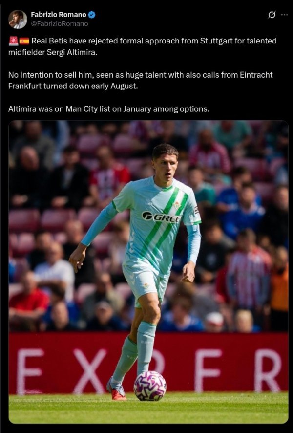 罗马诺:贝蒂斯拒绝斯图加特对阿尔蒂米拉的报价,以为自后劲广宽
