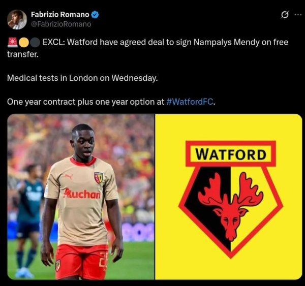 8月26日讯 据知名转会大家罗马诺报说念,沃特福德如故欢喜引进解放球员南帕里斯-门迪,球员将在周三前去伦敦完成体检,沃特福德将与其签约一年,并有蔓延一年选项。 南帕里斯-门迪现年33岁,是别称塞内加尔中场,上赛季服从于法甲朗斯。......查看更多