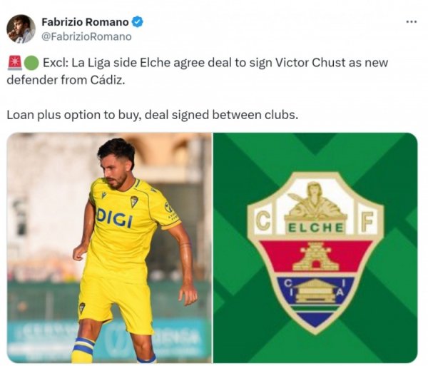 罗马诺:埃尔切租赁加的斯中卫丘斯特已矣左券,含遴荐买断要求