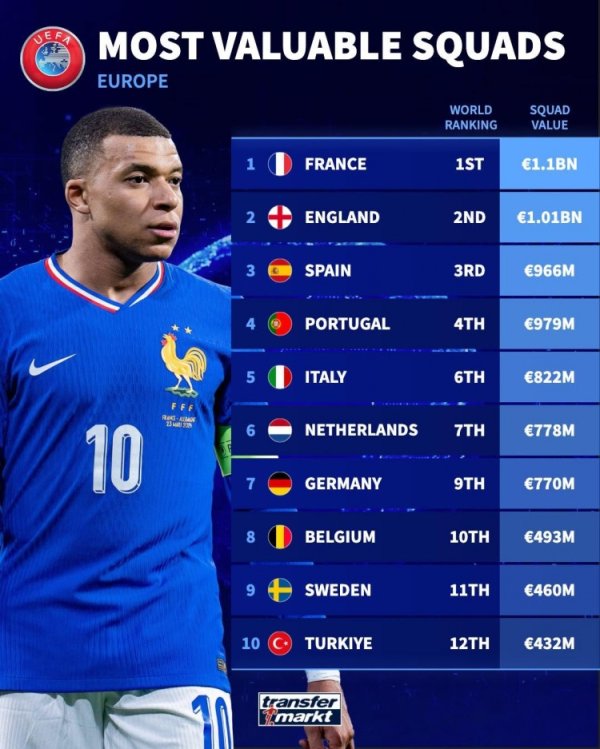 德转欧洲国度队身价榜:法国11亿欧第一,英格兰10.1亿欧第二